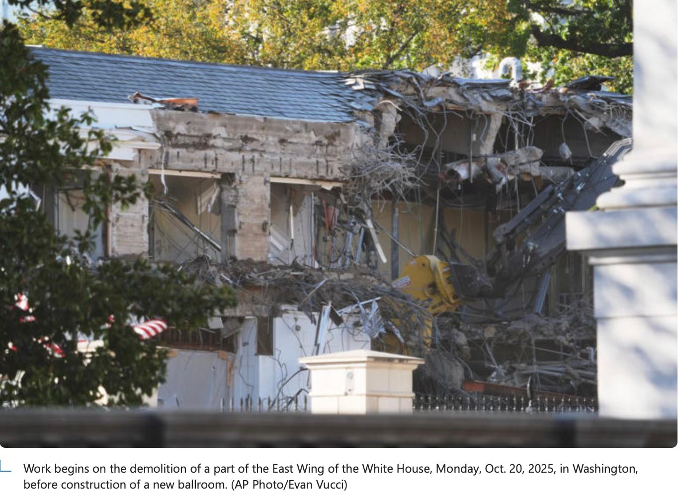 When President Trump fails to deliver plans for a $300 million ballroom to the National Capital Planning Commission. When he proceeds, without approval to destroy a colonnade designed and built by Thomas Jefferson, a bunker built by FDR during World War II and a rose garden laid out by Jacqueline Kennedy - he is showing contempt for regulatory democracy and simply accelerating a process begun by his Democrat predecessors.