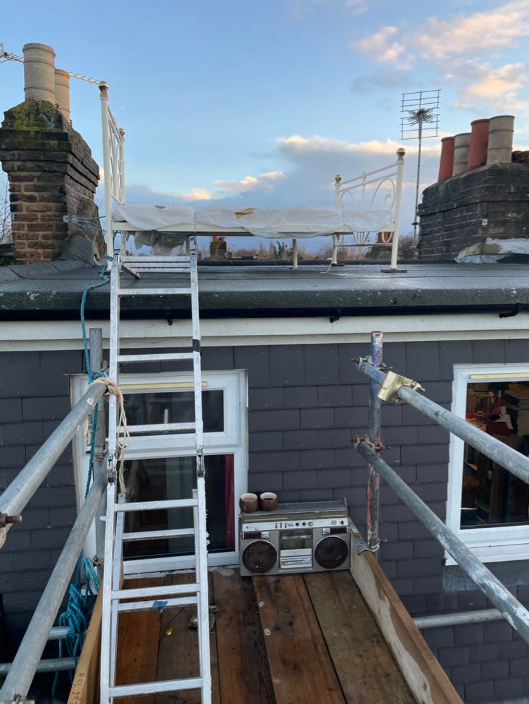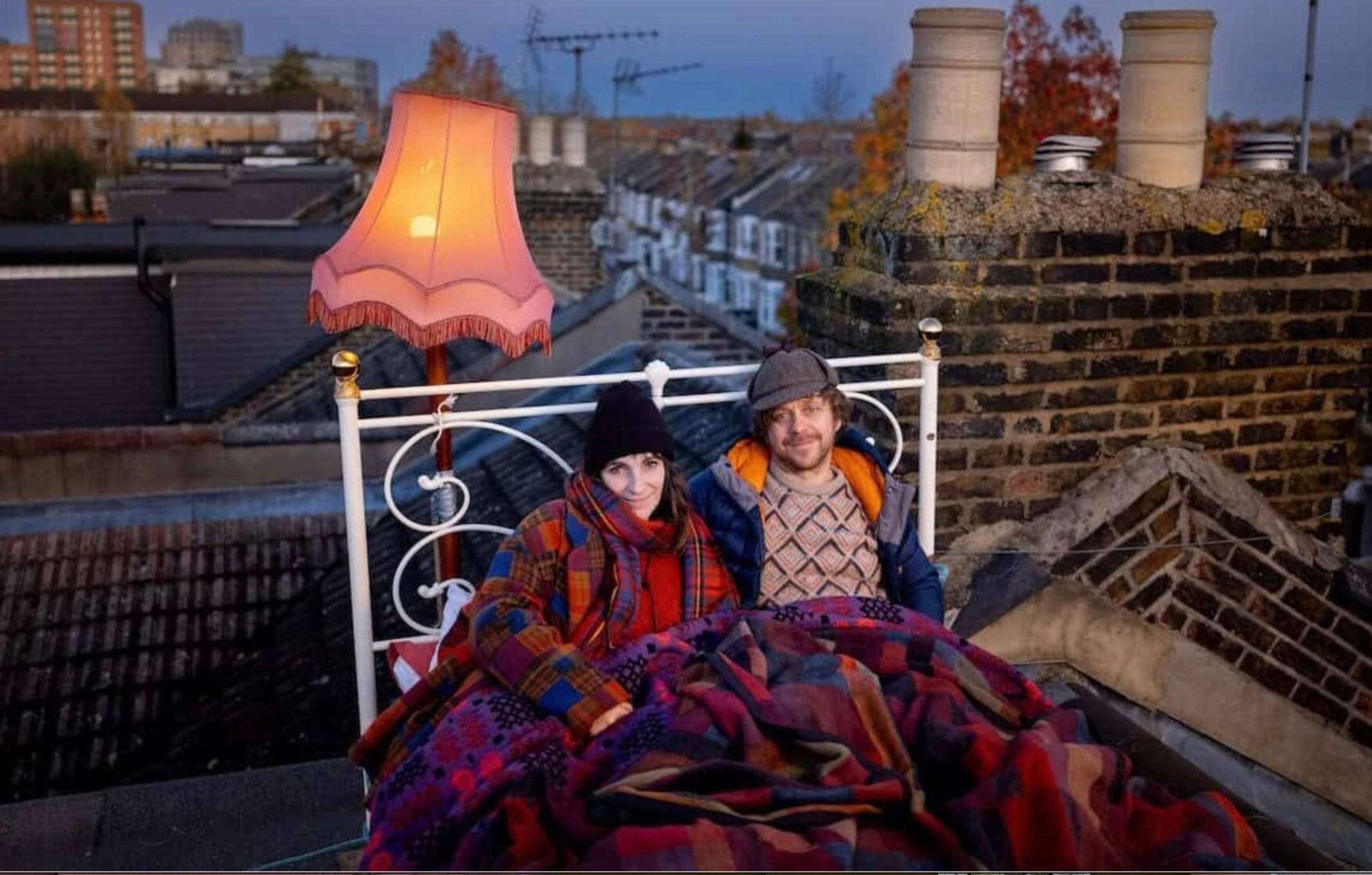 Pretty soon the question of available finance for impoverished neighbours and the financially strapped local primary school rose to the fore. The two artists decided to take the lead, make the sacrifice and raise the finance themselves. To do so they would spend winter nights on the roof of their house - until £100,000 was raised to finance the installation of solar panels. Scaffolding was erected over the roof, a double bed installed, with linen, heavy blankets and plastic sheets piled on.
